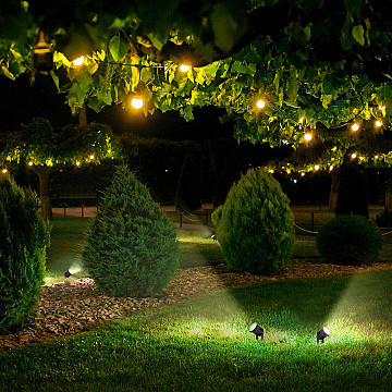 Projetados para iluminar copas de árvores altas e palmeiras. Com maior fluxo luminoso (até 950 lúmens), estes espetos garantem que a luz alcance grandes alturas com intensidade, transformando árvores em esculturas luminosas no período noturno.
