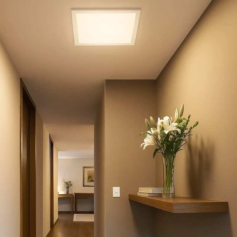 Diferente dos painéis convencionais, a Placa de Borda Infinita não possui moldura frontal, permitindo que a luz se espalhe lateralmente em um ângulo de até 180°. Isso elimina as áreas escuras no teto e proporciona uma sensação de amplitude e modernidade incomparável.